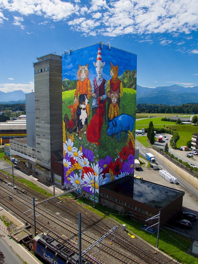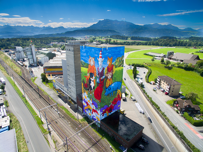 Der 45m hohe Betonturm der Niederhäuser Futter AG in Rothenburg (LU) hat uns schon lange fasziniert. Jürg Kamber, der Besitzer des Turmes der Niederhäuser Futter AG war begeistert von der Idee ein riesiges Wandbild an seinem Turm entstehen zu lassen.